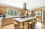 Further double doors lead to the Kitchen / Breakfast Room which has a range of contemporary fitted units with granite worksurfaces, including a central island / breakfast bar, with spotlights and wooden flooring throughout. There are a range of integrated appliances including wine cooler (negotiable) dishwasher, Rangemaster cooker and five ring electric hob. On through the kitchen is the Utility Room fitted with a range of units and worksurfaces, with plumbing for washing machine and space for tumble dryer. Off this, a bright and airy formal Dining Room has dual aspect windows and an electric coal effect fire within a stone fireplace and marble hearth.