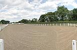 Manège 62m x 22m with sand and fibre surface and white plastic Duralock fencing surround with gates and flagpoles.
