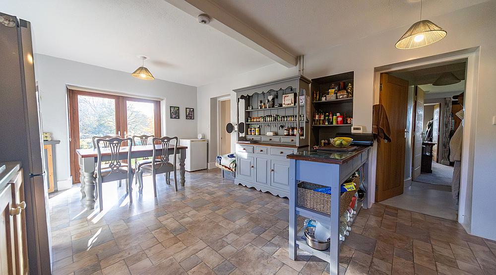 The spacious farmhouse Kitchen/Breakfast Room is fitted with an extensive range of built-in units including an island unit, five ring gas hob with stainless steel extractor hood, sink with drainer and mixer tap, plumbing for dishwasher, integral electric oven and glazed double doors opening out to the garden.